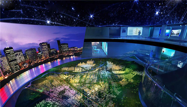 通过圆弧硬屏显示,采用多通道图形混合技术、三维空间背景处理系统、智能中央控制系统集成技术等,实现传统物理沙盘与圆弧屏双向交互显示、显示效果。动态的,可以从任何角度看,画面非常清晰,带来很好的沉浸体验。