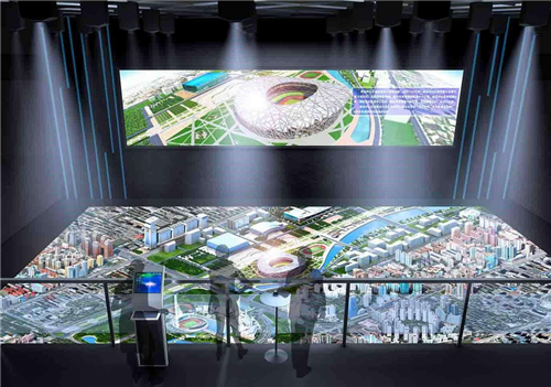 三维电子沙盘通过墙面或者地面大面积LED播放系统、大面积投影拼接系统,结合GIS城市地理信息系统海量数字城市模型数据,应用专利的软件、硬件、数据整合系统,配合使用,触摸控制屏、三维控制器、IPAD等多种互动控制平台,实现海量数字城市信息查询。墙面数字沙盘系统配合地面三维立体真实模型呈现虚拟与真实、多角度、全方位的数字城市信息。