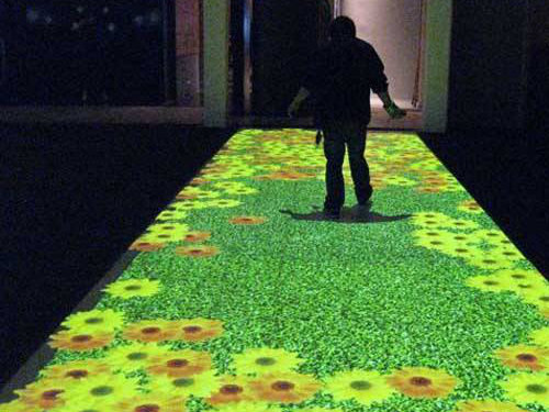 例如,时代互动所做出的地下鱼-水交互投影,当一个人在地面上行走时,水面会出现波纹,当水中的鱼碰到一个人的脚时,就会“吓跑”。它可以吸引游客和吸引人们直接吸引这样一种互动投影在地上。这种地面交互方式目前在商场和餐馆中使用得更频繁,并且能够迅速吸引人群的注意。