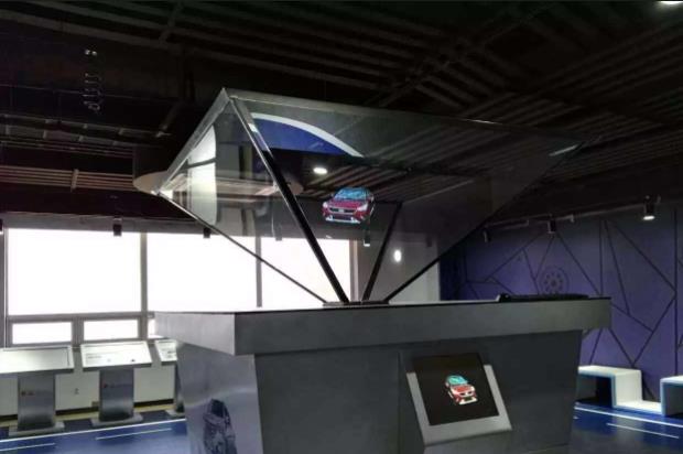 全息投影不是利用数字技术实现的,而是通过安装在全息展示柜上方或下方的投影仪或LED显示器,将光源折射到45度的幻影成像胶片上,在倒置三角形或正三角形结构上显示,实现真实的三维虚拟场景。