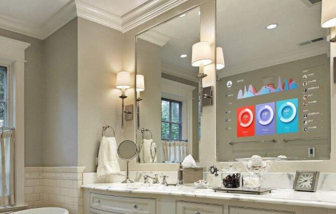 卫生间魔镜的镜面显示器具有清洁系统、除雾和清洁表面的功能。镜子在恒温下加热后,不会起雾和凝结水滴,镜子将始终保持透明和明亮。