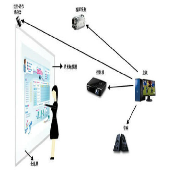 系统主要由红外运动传感器、视频抓拍摄像头、全息屏、服务主机和音频设备组成。