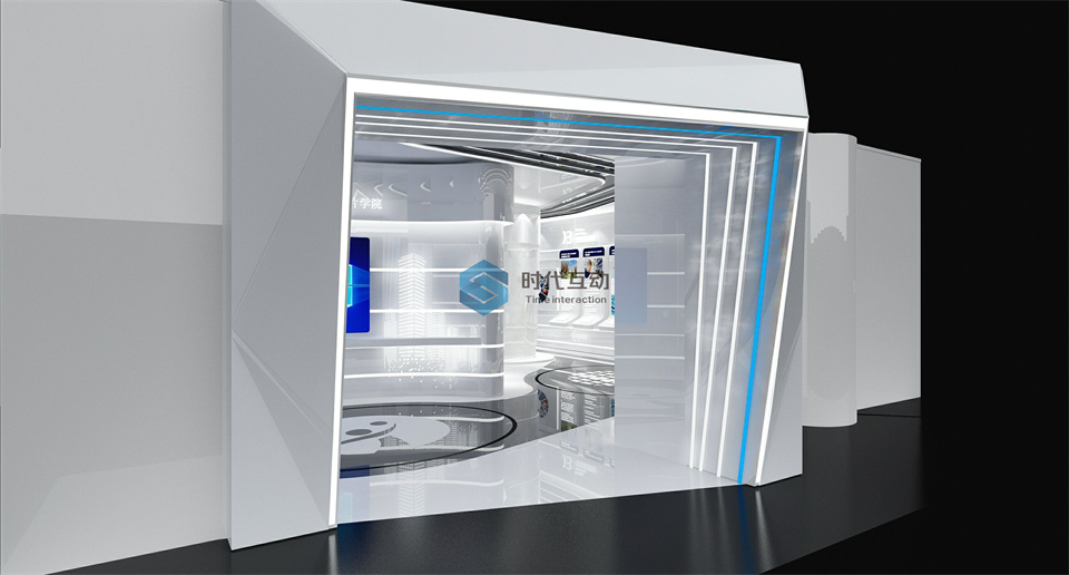 芯片微电子学院展厅设计色彩以科技蓝、洁净白、芯片黑为展厅基调,融合时尚炫彩等多媒体,使整个空间色彩绚丽、鲜明、简洁。芯片微电子展厅动线按照人体工学原理,观者浏览的顺序指定动线。由进到出顺畅流利,不走回头路。