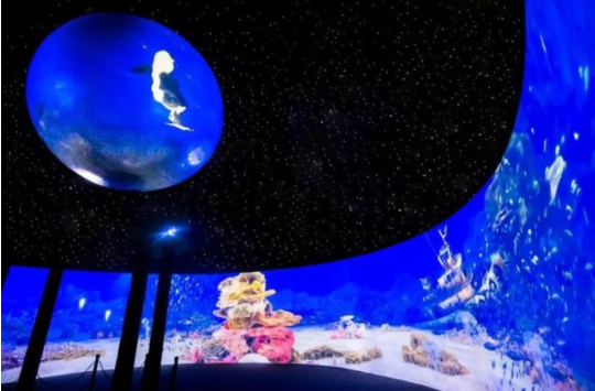 在海洋环境保护主题展厅,相关海洋环境宣传片通过液晶拼接在大屏幕上展示,向观众展示海洋环境污染现状和人们保护海洋环境的努力。同时,通过全息投影技术的应用,观众仿佛置身于沙滩的边缘。随着潮起潮落,沉入海底的垃圾偶尔会出现在屏幕上,轻轻一动手就能轻松消除。对于想要探索神秘海洋世界的观众来说,通过虚拟现实技术的应用,让观众与浩瀚的海洋亲密接触,低头或转头时,就上演了一场与海洋生物擦肩而过的画面。